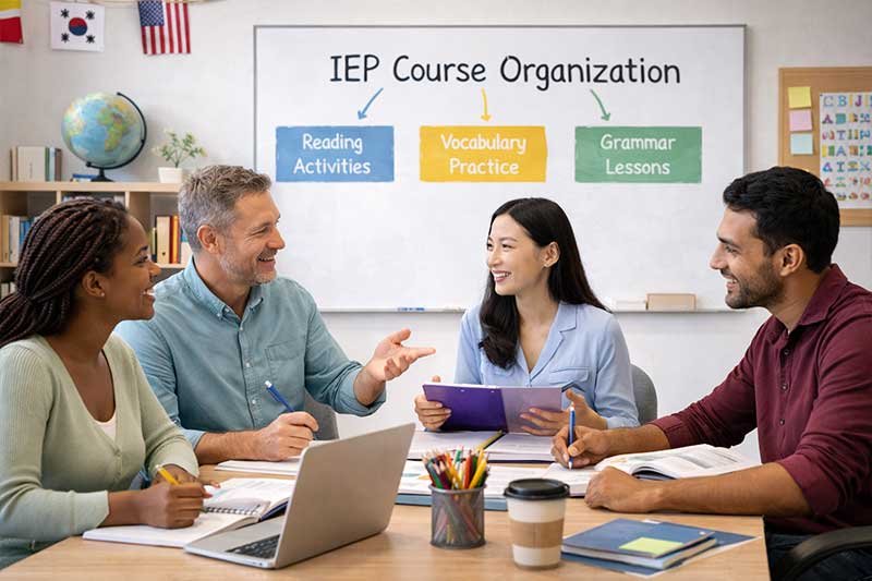 IEP courses guide students step by step to improve English in reading, writing, speaking, and listening.