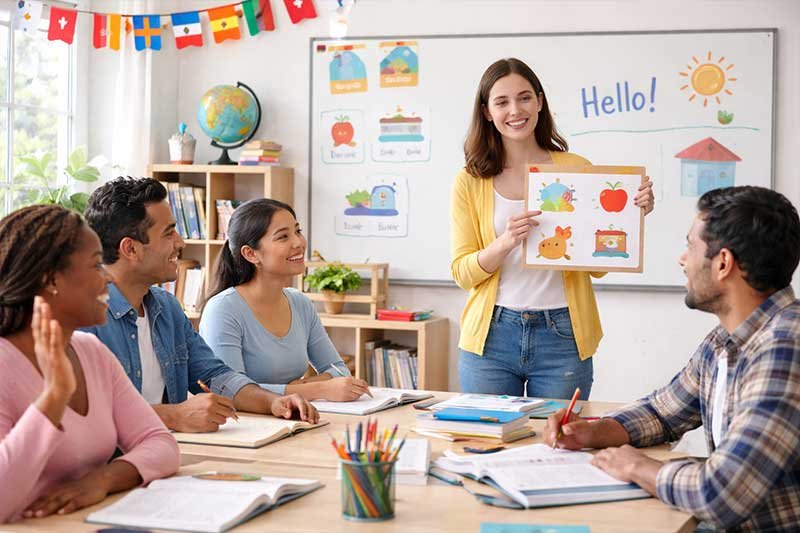 Teaches students basic English words, simple sentences, and how to talk in daily life