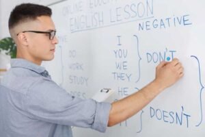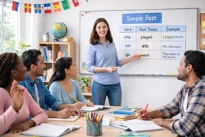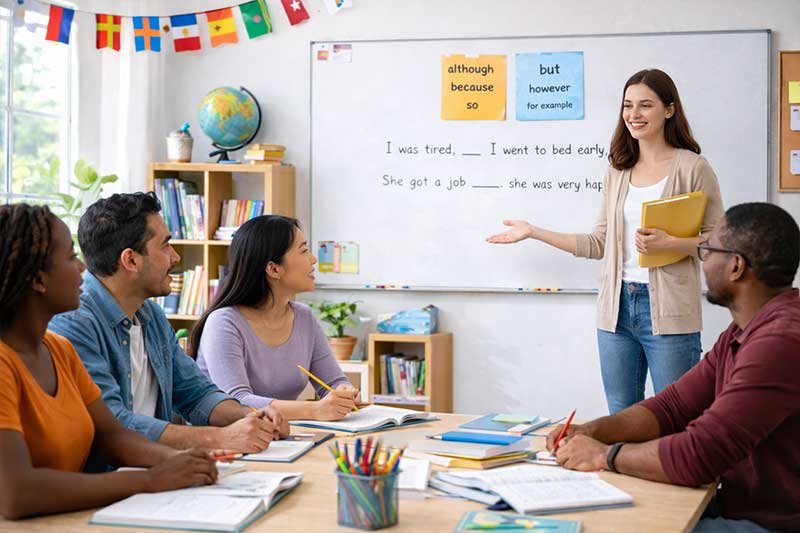 Students build on basic English by learning new words, forming longer sentences, and practicing simple conversations.