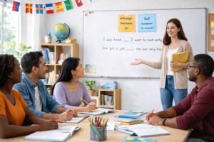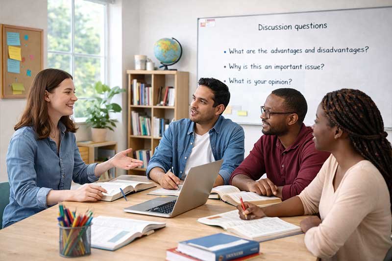 Students enhance their English by discussing complex topics, reading advanced texts, and writing well-structured paragraphs.