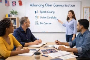 Students practice speaking and writing clearly, improving pronunciation, grammar, and overall communication skills.