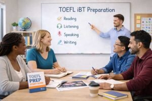 Students prepare for the TOEFL iBT by practicing reading, writing, listening, and speaking skills for the exam.